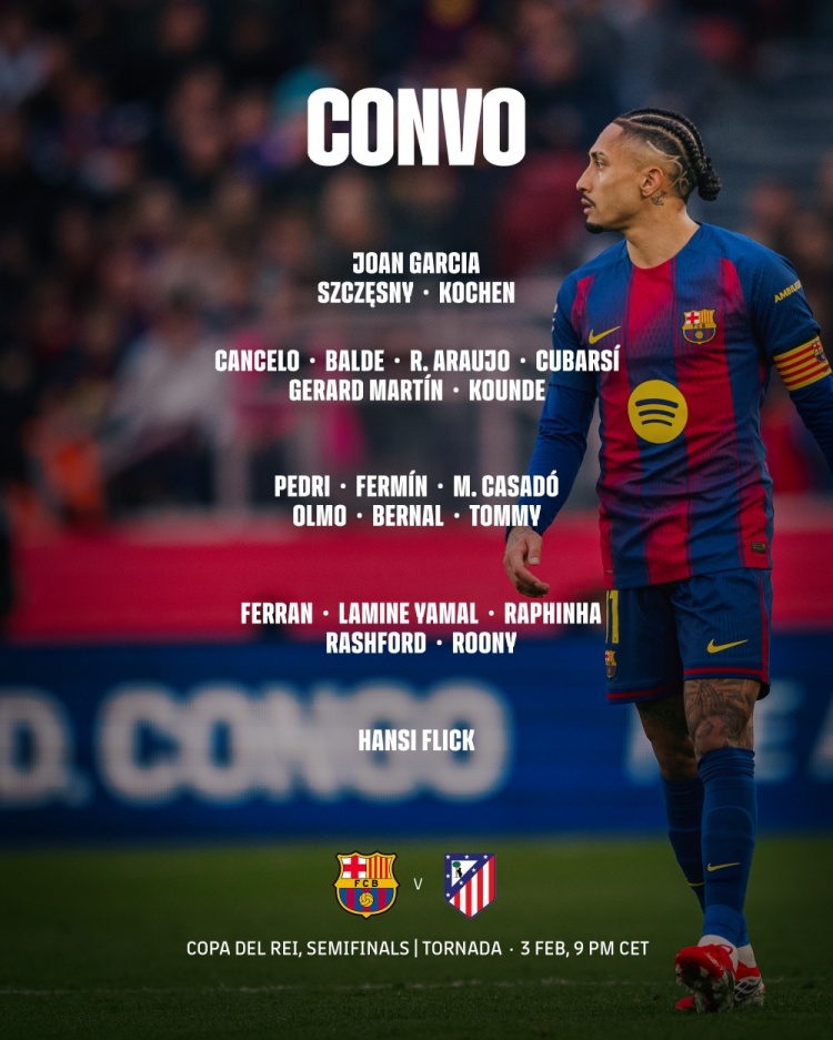3月3日讯 北京时间明天凌晨4点,巴萨将在国王杯半决赛次回合比赛中主场对阵马竞,首回合巴萨0-4落败。巴萨公布了此役的球员名单,莱万因眼眶受伤缺席。